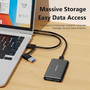 Crafted from durable aluminum, this hard disk not only offers a sleek aesthetic but also enhanced protection against everyday wear and tear. Its solid state drive (SSD) architecture contributes to increased longevity and reliability, making it an ideal choice for data storage.